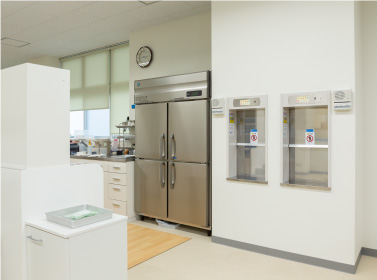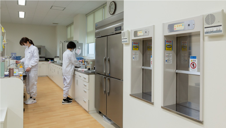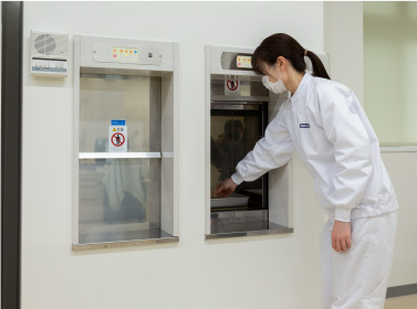 1階・3階の製造室でつくった液体調味料サンプルを2階の開発室にて品質検査を行うため、商品サンプルの受け渡しにコンパクトリフトをご利用いただいています。食品工場は製造室内入室時にエアシャワーやローラー、手洗いなどを一通り行わなくてはいけないため、昇降機があることで時間ロスを削減し、受け渡しが簡便になったと大変満足いただいております。また、利用していくうちに「到着音が聞き取りづらい」というご意見もあり、後付けで左右のスピーカーを設置しました。設置したら終わりではなく、設置後のメンテナンス等もお任せください。