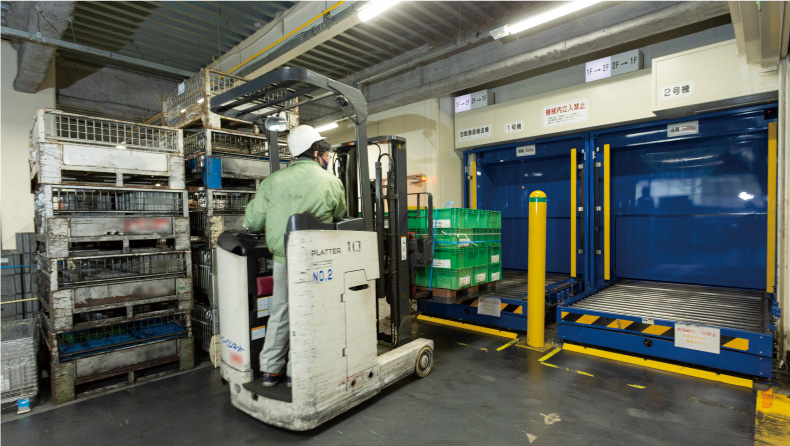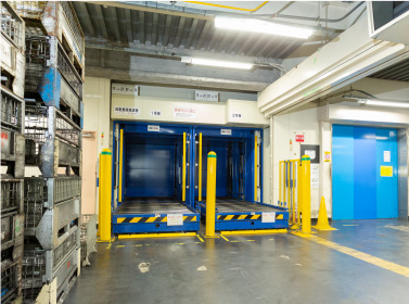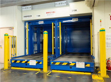 国内外の自動車メーカー向け部品梱包作業を担う物流倉庫内に設置されているサンリフター。1階で搬入された部品を2階で梱包、2階で梱包されたものを1階で発送する際に利用いただいています。何百種類もの部品を1日で何百回も運ぶ必要があるため、フォークリフトを使用して、2基のサンリフターをフル活用。1時間に100回以上のスピードで利用されても止まることなく動き続けます。